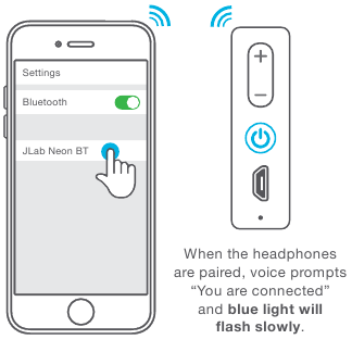 (Quando os fones de ouvido Neon Wireless estiverem desligados, pressione e segure o botão Power (Ligar) por aproximadamente 10 segundos. A luz vermelha e azul piscando rapidamente indica a busca por um dispositivo Bluetooth.)- Selecione "JLab Neon BT" nas configurações do seu dispositivo para conectar.