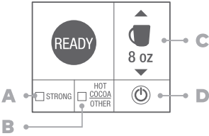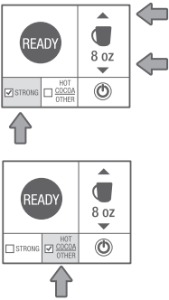 Selecione o tamanho do seu preparo usando as setas na tela. Selecione FORTE (STRONG) se desejar. (A configuração FORTE (STRONG) é para café.) Pressione CHOCOLATE QUENTE/OUTRO (HOT COCOA/OTHER) para bebidas não relacionadas a café selecionadas.