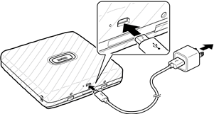 Conecte a impressora usando o cabo Micro USB fornecido a um adaptador AC USB (fornecido com seu smartphone) e, em seguida, conecte o adaptador AC USB a uma fonte de alimentação interna.