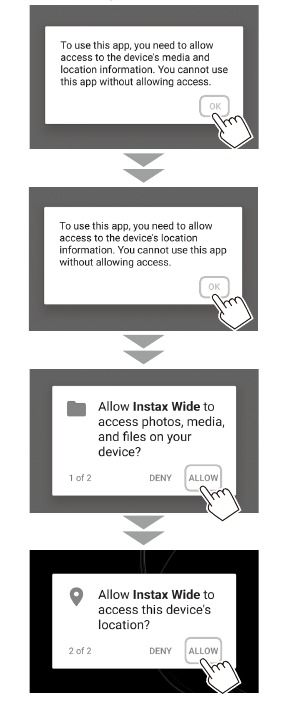 *Requisitos para smartphones com sistema operacional Android: Android Ver. 5.0 ou superior com a Google Play Store instalada - Se você estiver usando um smartphone iOS, procure o Instax Wide Smartphone App na App Store e instale-o.