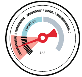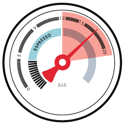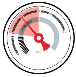 A agulha do manômetro, quando posicionada em qualquer lugar dentro da zona 5-12 durante a extração, indica que o expresso foi extraído na pressão ideal.