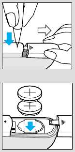 Usando a ponta de uma caneta esferográfica, pressione a trava da porta da pilha para abrir o compartimento da pilha. Remova as pilhas e substitua por pilhas novas, certificando-se de que os polos estejam na direção correta.