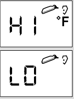 ![]() | A temperatura medida não está dentro da faixa de temperatura humana típica (34°C - 42,2°C / 93,2°F - 108°F). HI = muito alto LO = muito baixo | Certifique-se de que um novo filtro de lente limpo esteja conectado e que o termômetro esteja inserido corretamente. Em seguida, meça uma nova temperatura. |