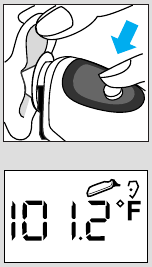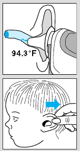 - Enquanto puxa a orelha, encaixe a sonda firmemente no canal auditivo o máximo possível e pressione o botão de ativação (activation button). Solte-o quando ouvir um bipe. Este é o Temp Beep que confirma o final da medição.