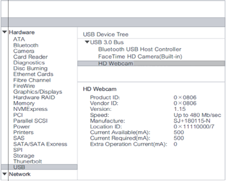 Para verificar se a webcam está conectada em um computador Mac, clique no Menu Apple (no canto superior esquerdo da tela) e clique em Sobre este Mac. Clique em Relatório do Sistema na janela pop-up que aparece. A janela Informações do Sistema para o seu Mac aparecerá. Navegue até a seção USB e verifique se a webcam está listada como um dispositivo conectado (como na foto abaixo):