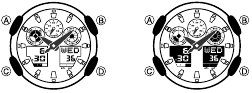 - A operação do cronômetro continua mesmo se você sair do Modo Cronômetro (Stopwatch Mode). Se você sair do Modo Cronômetro (Stopwatch Mode) enquanto uma operação de cronômetro estiver em andamento, os segmentos no mostrador superior direito aparecerão e desaparecerão sequencialmente conforme os segundos do cronômetro são contados. Isso é para informar que uma operação de cronômetro está em andamento.