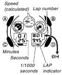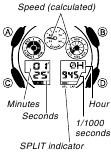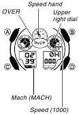 - Enquanto uma operação de medição de tempo decorrido está sendo realizada no Modo Cronômetro (Stopwatch Mode), o relógio exibirá um valor de velocidade, que é calculado com base na distância que você especificou e no tempo decorrido. A velocidade é indicada pelo mostrador superior direito, dois indicadores (1000 e MACH) e o ponteiro de velocidade.