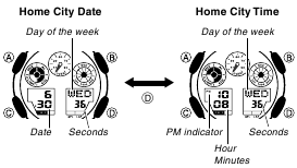 Você pode ajustar a cidade da Hora Local, a data e a hora no Modo de Indicação das Horas.