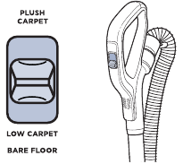 Nota: A escova giratória DESLIGA quando o aspirador está travado na posição vertical. - Use o controle do tipo de carpete para uma limpeza otimizada em carpetes de pelo alto e pelo baixo. O controle pode ser movido para a posição central para carpetes de pelo médio.