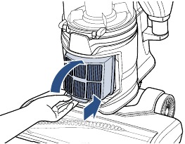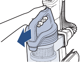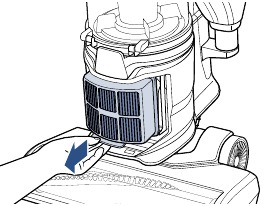 - Pressione a aba para baixo para remover a tampa do filtro pós-motor e puxe para longe do aspirador.