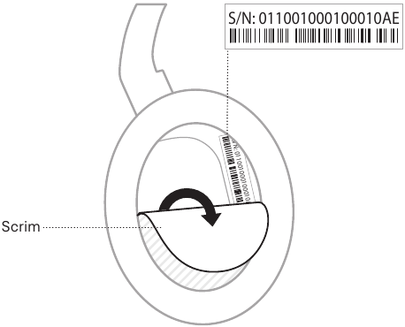 O número de série está localizado dentro do protetor auricular direito, sob a tela. A tela é a tela interna que cobre e protege os