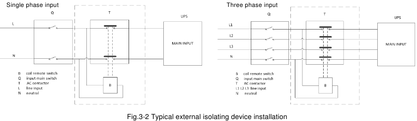 Aviso: É necessário instalar um dispositivo de isolamento externo contra retroalimentação de corrente entre a entrada da rede elétrica e o UPS. Após a instalação do dispositivo, deve ser adicionada uma etiqueta de aviso com os seguintes dizeres ou equivalente no contator CA externo: RISCO DE RETROALIMENTAÇÃO DE TENSÃO. Isole o UPS antes de operar neste circuito e, em seguida, verifique se há tensão perigosa entre todos os terminais. A corrente nominal do contator T - CA deve ser superior a 1,3 vezes a capacidade do UPS