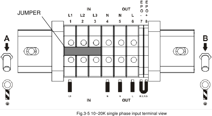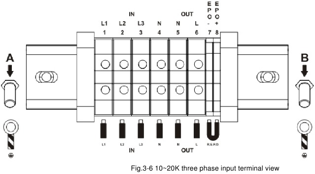 - O UPS deve ser instalado com uma conexão de aterramento. Ele tem uma alta corrente de fuga. O primeiro fio a ser conectado é o fio de aterramento, que deve ser conectado ao terminal marcado como PE (amarelo/verde).