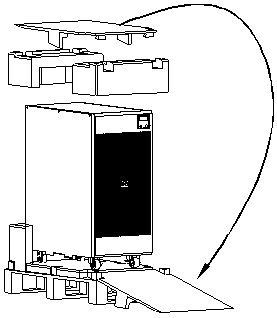 - Coloque o slide removido anteriormente na parte de trás do pallet (veja a figura). Certifique-se de que o slide esteja firmemente apoiado contra o pallet para que permaneça no lugar durante as operações de descarga. Puxe o UPS da frente com cuidado ao deslizá-lo para fora do pallet.