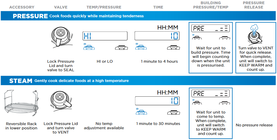 O tempo para a pressão variar com base na quantidade e temperatura dos ingredientes, juntamente com o nível de pressão selecionado, e pode levar até 20 minutos.