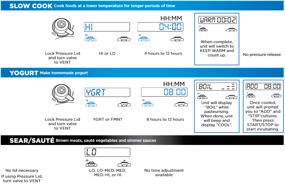 Note: Para ajustar as configurações durante o cozimento, pressione o botão TEMP (TEMP.) ou TIME (TEMPO), então use o dial START/STOP (INICIAR/PARAR) para escolher a temperatura ou o tempo desejado. - KEEP WARM (MANTER AQUECIDO): Após cozinhar sob pressão, cozinhar no vapor ou cozinhar lentamente, a unidade mudará automaticamente para o modo Keep Warm (Manter Aquecido) e começará a contar. Keep Warm (Manter Aquecido) permanecerá ligado por 12 horas, ou você pode pressionar KEEP WARM (MANTER AQUECIDO) para desligá-lo.