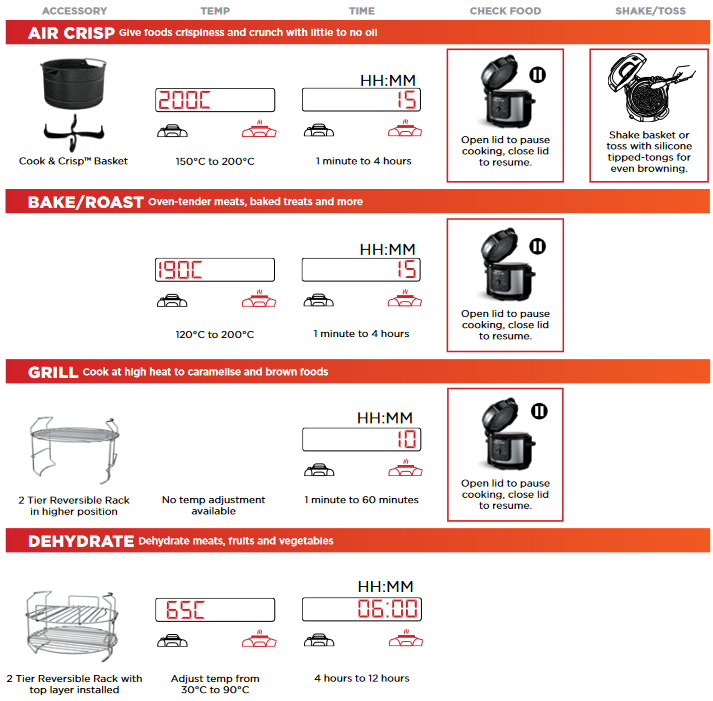 Para melhores resultados, use a camada superior para crocância, a camada inferior para assar no forno e o fundo da panela para ingredientes mais úmidos.
