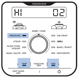 Use o botão START/STOP (INICIAR/PARAR) para selecionar PRESSURE (PRESSÃO). Pressione TEMP (TEMP.) e defina para HI (ALTA). Pressione TIME (TEMPO) e defina para 2 minutos. Pressione o botão START/STOP (INICIAR/PARAR) para começar.