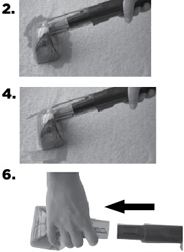- Limpe a parte frontal da ferramenta removendo a placa sobre o percurso de sucção. Puxe para baixo a parte inferior da placa para remover. Passe a ferramenta e a placa por água limpa para enxaguar, tendo o cuidado de remover todos os detritos. Substitua a placa frontal deslizando-a de volta para o lugar.