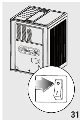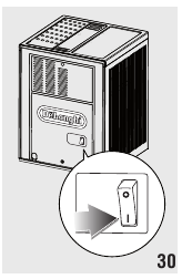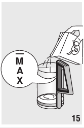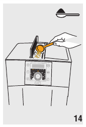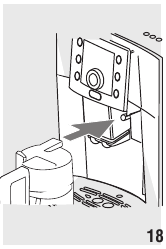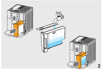 - Despeje o descalcificador diluído com água (respeitando as proporções indicadas na embalagem do descalcificador) no depósito de água. Use sempre o descalcificador recomendado pela De'Longhi (contacte um centro de atendimento ao cliente autorizado).