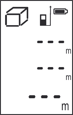 aparecerá no visor. Faça 3 medições uma após a outra (comprimento, largura, altura). O volume (composição de comprimento, largura e altura) será calculado e mostrado na linha principal no visor.