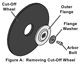 - Remova o parafuso do mandril, a arruela flangeada, o flange externo e o disco de corte. Consulte a Figura A.