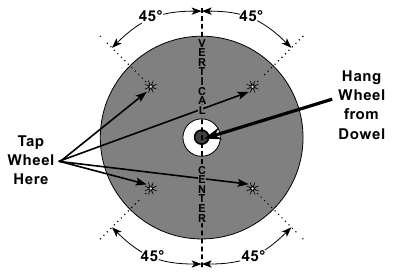- Toque na face plana do disco com um objeto leve não metálico, como o cabo de uma chave de fenda, num ponto a 45° da linha central vertical em cada lado do disco e a 2,5 - 5 cm da borda do disco (ver Figura B).
