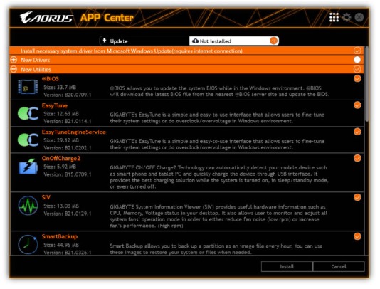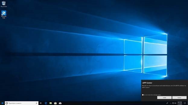 Depois de instalar o sistema operativo, uma caixa de diálogo aparecerá no canto inferior direito do ambiente de trabalho a perguntar se pretende transferir e instalar os controladores e as aplicações GIGABYTE através do APP Center. Clique em Install (Instalar) para prosseguir com a instalação. (Na Configuração do BIOS, certifique-se de que a opção Settings\lO Ports\APP Center Download & Install Configuration\APP Center Download & Install (Definições\Portas de E/S\Configuração de transferência e instalação do APP Center\Transferência e instalação do APP Center) está definida como Enabled (Ativado).)