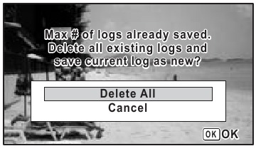 Mesajul [Max # of logs already saved. Delete all existing logs and save current log as new?] (Număr maxim de jurnale deja salvate. Ștergeți toate jurnalele existente și salvați jurnalul curent ca nou?) este afișat. - Utilizați controlerul cu patru direcții (