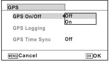 - Funcția GPS este dezactivată ca setare implicită. Pentru a o utiliza, setați [GPS On/Off] (GPS Activat/Dezactivat) la [On] (Activat).