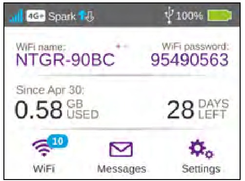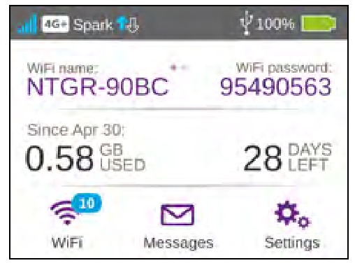 | Numele WiFi (SSID) și parola WiFi (cheia de securitate) | Afișate pe ecranul de pornire când hotspotul este pornit și, de asemenea, sub baterie. Parola este sensibilă la majuscule și minuscule. |