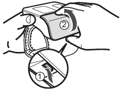 ![Omron - R1 - Aplicarea manșetei de încheietură Aplicarea manșetei de încheietură]()