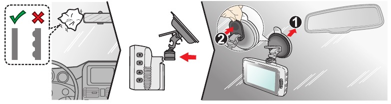 - Pentru a asigura înregistrări de cea mai bună calitate, vă recomandăm să plasați camera de bord lângă oglinda retrovizoare.