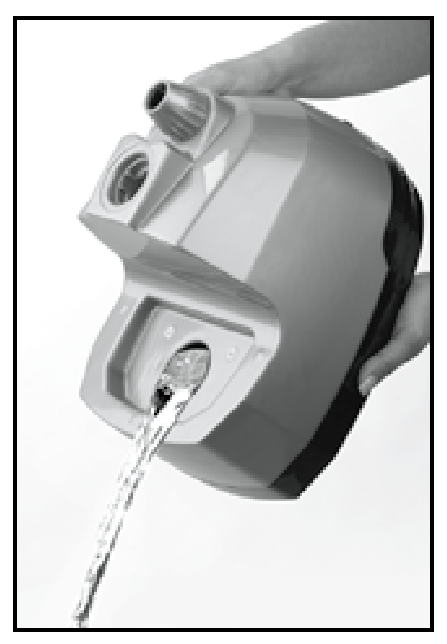 Scoateți rezervorul de apă cu mânerul și întoarceți-l cu susul în jos. Deșurubați supapa din centrul bazei. Umpleți rezervorul ținându-l sub o sursă de apă rece curentă până când este umplut la nivelul dorit. Nu umpleți excesiv. Înșurubați capacul supapei pe rezervorul de apă și readuceți rezervorul în poziție verticală. Așezați rezervorul de apă pe bază și asigurați-vă că este așezat corect în recipient.