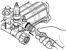 - Cu capacul bujiei deconectat și comutatorul motorului în poziția OFF (oprit), trageți de mânerul de pornire de mai multe ori pentru a descărca antigelul din fitingul de ieșire al pompei înainte de a utiliza mașina de spălat cu presiune.