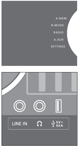 - Când redați muzică de pe o sursă line-in, navigați în muzică și porniți și opriți redarea direct pe dispozitivul portabil.