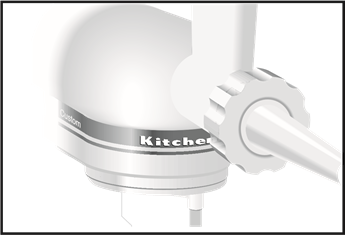 - Strângeți butonul de atașare rotindu-l în sensul acelor de ceasornic până când atașamentul este complet fixat pe mixerul vertical.