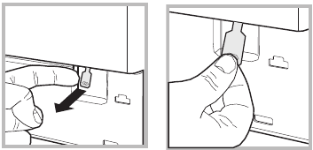 - trageți spre exterior folosind clapeta, așa cum se indică în figură, până când tija de plastic este eliberată din poziția sa de oprire; trageți în jos și deschideți ușa în același timp.