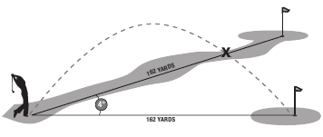 Distanța până la steagul A din desenul de mai jos este de 162 de yarzi. Este, de asemenea, de 162 de yarzi până la steagul B, deși se află pe o pantă. Cu toate acestea, dacă ați juca această gaură ca 162 de yarzi, mingea (X) ar cădea mai scurt de gaură/steag, deoarece nu ați luat în considerare panta.