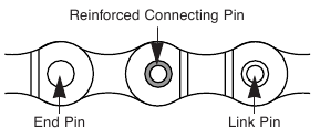 - Există două tipuri diferite de știfturi de conectare ranforsate disponibile. Asigurați-vă că verificați tabelul de mai jos înainte de a selecta ce știft să utilizați. Dacă se utilizează știfturi de conectare altele decât știfturile de conectare ranforsate, sau dacă se utilizează un știft de conectare ranforsat sau o unealtă care nu este potrivită pentru tipul de lanț, este posibil să nu se obțină o forță de conectare suficientă, ceea ce ar putea cauza ruperea sau căderea lanțului.