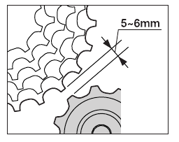 Setați schimbătorul spate în poziția de viteză cea mai mică, opriți rotirea roții și apoi verificați dacă distanța de la marginea rolei de ghidare până la marginea celui mai mare pinion se află în intervalul de 5 - 6 mm. Rotiți brațul manivelei pentru a schimba vitezele și verificați dacă nu există rugozitate la atingere. Dacă numărul de dinți pentru pinionul casetei este modificat, efectuați din nou această setare.