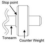 - Glisați greutatea de echilibrare a brațului fonografic pe arborele din spate al brațului fonografic și împingeți-o cât mai aproape de punctul de oprire. Acest lucru va seta automat forța de apăsare a acului să fie în intervalul pentru acul montat din fabrică (2,5g-3,5g).