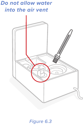 Notă: Nu scufundați niciodată baza în apă. - Utilizați peria de curățare inclusă pentru a îndepărta orice acumulare de calcar din interiorul rezervorului de apă sau din camera interioară. [Figura 6.3]