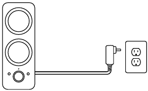 - Conectați ștecherul de alimentare CC la partea din spate a difuzorului din dreapta și conectați adaptorul de curent alternativ la priza electrică.