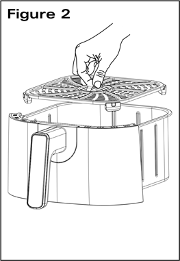 - Coborâți tava astfel încât cele 4 mânere de cauciuc să se potrivească perfect în baza coșului. (Vezi Figura 2). Utilizați întotdeauna orificiul central al tăvii de rumenire pentru a ridica tava de rumenire în sus și afară din coșul de prăjire.