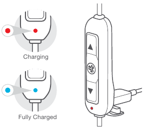 - Индикатор загорится красным во время зарядки и станет синим, когда зарядка будет завершена.
