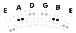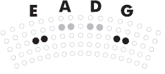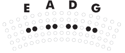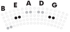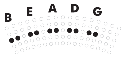 Режим отображения Needle (стрелка) - Настройте свой инструмент в соответствии с положением "стрелки". Когда нота настроена, загораются пять зеленых центральных светодиодов, а также левая и правая стрелки. (см. выше)