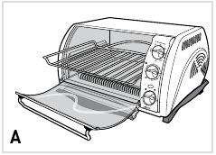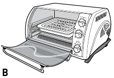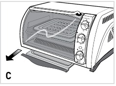 - Чтобы снять поддон для крошек, возьмитесь за ручку в передней части духовки и вытащите его (C). Выбросьте крошки и вымойте поддон в теплой мыльной воде. Удалите стойкие пятна нейлоновой сетчатой губкой. Обязательно тщательно высушите перед тем, как вставить поддон обратно в духовку.