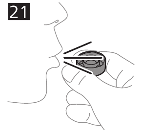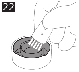 - Чтобы удалить волоски с внутренней стороны головки для удаления волос, сначала выдуйте их (Рис. 21), а затем вычистите оставшиеся волоски щеточкой для чистки (Рис. 22).