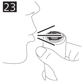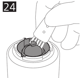 - Чтобы удалить волоски из камеры для волос, сначала выдуйте их (Рис. 23), а затем вычистите оставшиеся волоски щеточкой для чистки (Рис. 24).